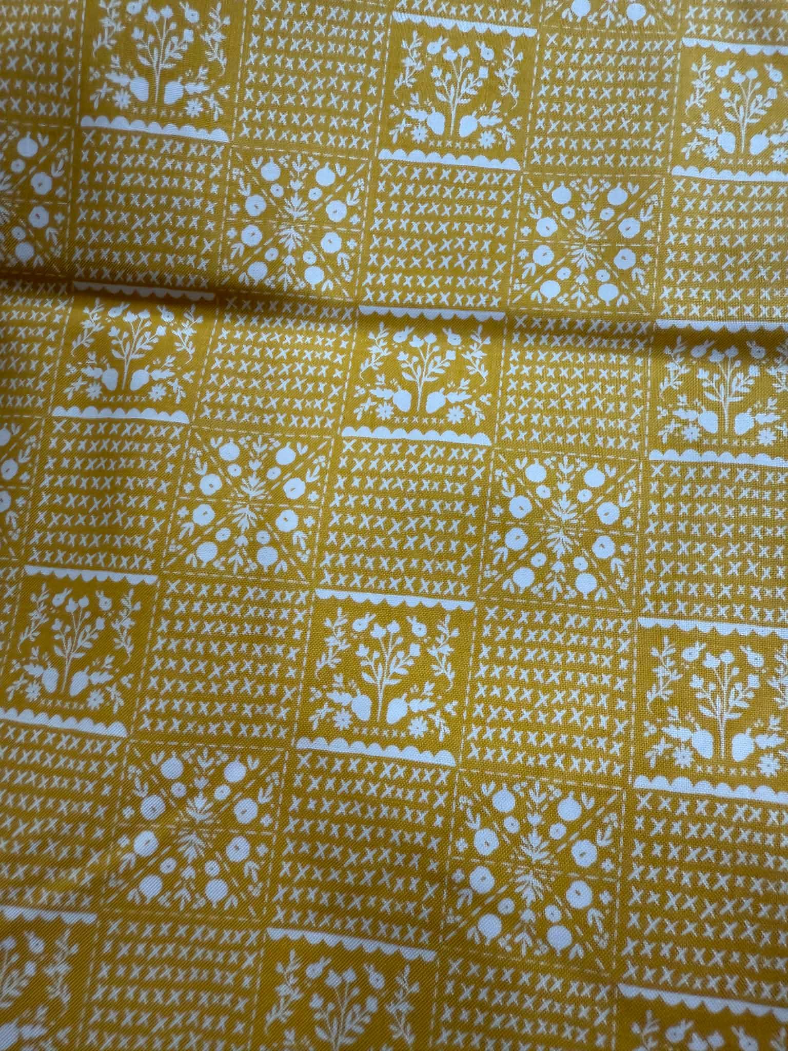 Heirloom-style tile/square motif in warm mustard/gold and white tones