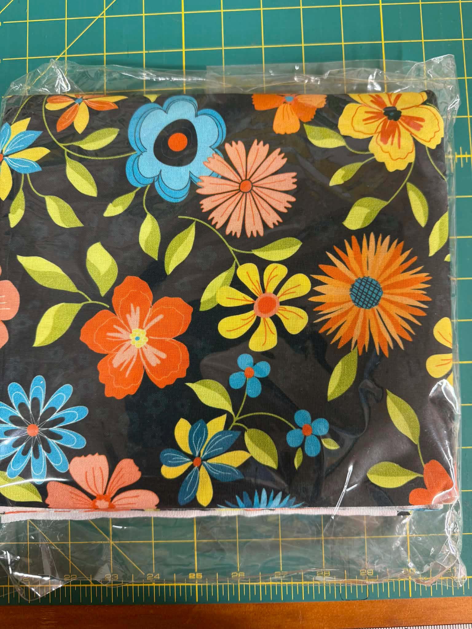 The product in the image is a fabric from the "Here Comes the Sun" collection by designer Sandy Gervais for Riley Blake Designs. The fabric is a wide-back quilting cotton, typically 107 or 108 inches wide, and is often sold in pre-cut 3-yard packages. It features a floral pattern with large and medium-scale blossoms and leaves in colors like coral, aqua, and soft gold on a deep midnight-blue or black background.