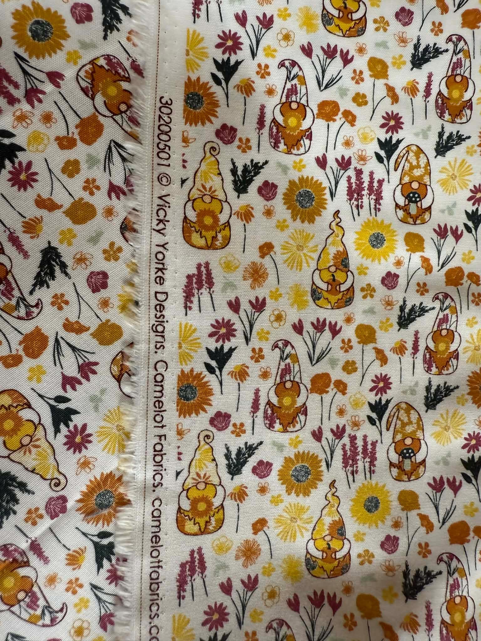 This is the "Gnome Worry Be Happy" fabric from the "Harvest Time" collection by Vicky Yorke for Camelot Fabrics.