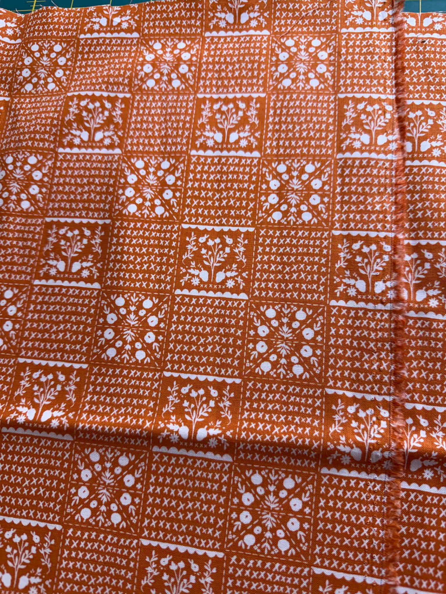 Brand: The fabric is from Riley Blake Designs. Material: It is 100% cotton, which is a common material for Riley Blake's quilting fabrics. Design: The pattern features a repeating block design with a floral motif in some squares and a cross-stitch-like texture in others. The color is orange with a white design. Possible Collections: Riley Blake Designs has released many collections with similar themes and colors, including "Shades of Autumn", "Awesome Autumn", and "Happy Fall Days