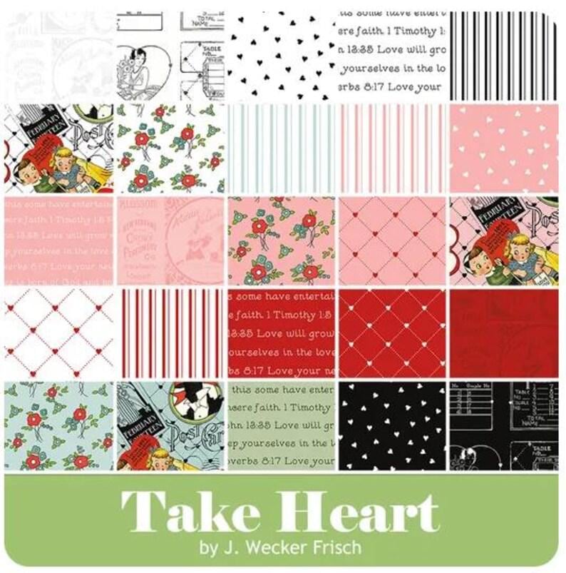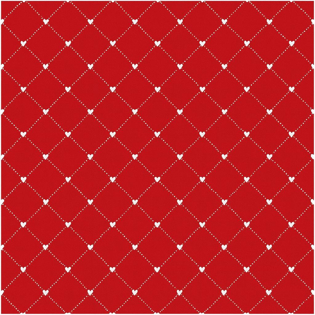 The fabric is from the collection “Take Heart” by J. Wecker Frisch for Riley Blake Designs,It features a red background with a dotted grid and white hearts at intersections. It is 100% cotton, 43/44″ wide. Sold by the yard.